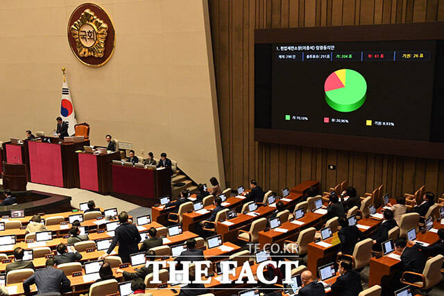 [더팩트ㅣ국회=남용희 기자] 30일 오후 서울 여의도 국회 본회의장에서 열린 제410회 국회(정기회) 제12차 본회의에서 이종석 헌법재판소장 임명동의안이 가결되고 있다.