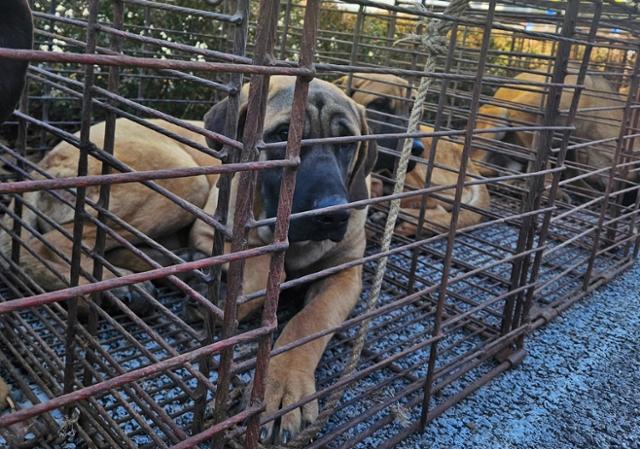 30일 오전 정부세종청사 앞에 육견협회가 케이지에 넣은 개들을 전시했다. 개들은 현재 지방자치단체 보호소로 이동한 상태다. 동물권행동 카라 제공 |