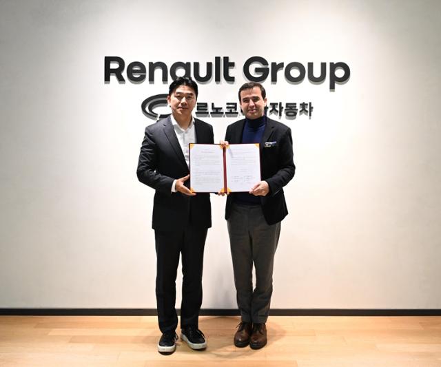 29일 서울 강남구 르노코리아 서울사무소에서 이종호(왼쪽) 티맵모빌리티 대표와 스테판 드블레즈 르노코리아 대표가 업무협약(MOU)을 체결한 뒤 기념 촬영을 하고 있다. 르노코리아 제공 |