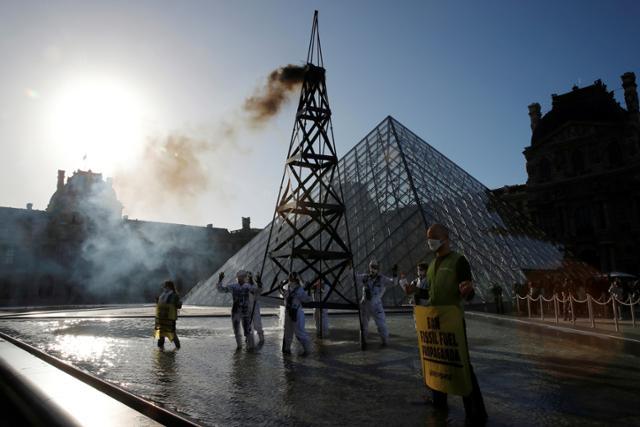 지난달 6일 프랑스 파리 루브르박물관 앞에서 그린피스 활동가들이 세계 화석연료 생산·소비를 반대하는 시위를 하고 있다. 파리=로이터 연합뉴스 |