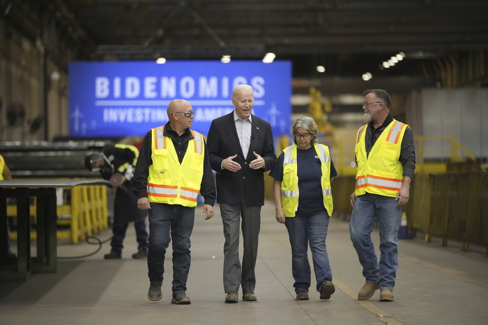 조 바이든 미국 대통령이 29일 (현지시간) 콜로라도주에 있는 세계 최대 풍력타워 제조업체이자 한국 기업인 CS윈드를 방문해 공장을 둘러보고 있다. 이날 공장에는 ‘바이드노믹스, 미국에 투자를’이라고 적힌 큰 배너가 걸렸다. [AP = 연합뉴스] |