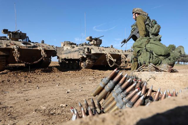 이스라엘과 팔레스타인 무장 정파 하마스 간 휴전이 7일째로 접어든 30일, 한 이스라엘 군인이 가자지구 국경 근처에 있는 이스라엘 남부에서 무장수송차 옆을 지나가고 있다. AFP 연합뉴스 |