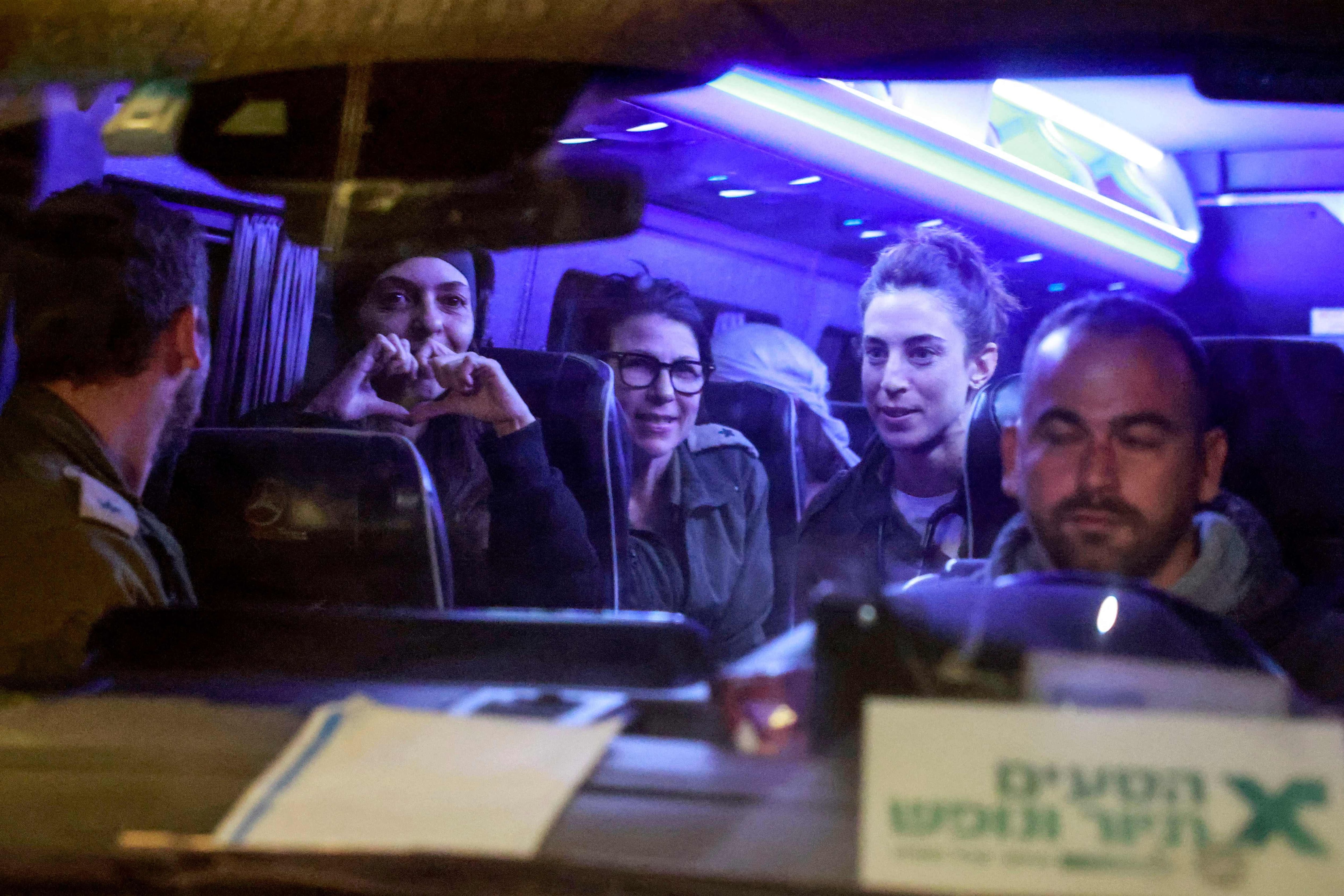 새로 풀려난 이스라엘 인질들이 30일(현지시간) 이스라엘 남부 오파킴의 군 기지에 도착하고 있다. 이스라엘과 팔레스타인 무장정파 하마스의 일시휴전 엿새째인 전날 하마스는 이스라엘 인질 10명을 풀어줬다. 2023.11.30/AFP 연합뉴스 |