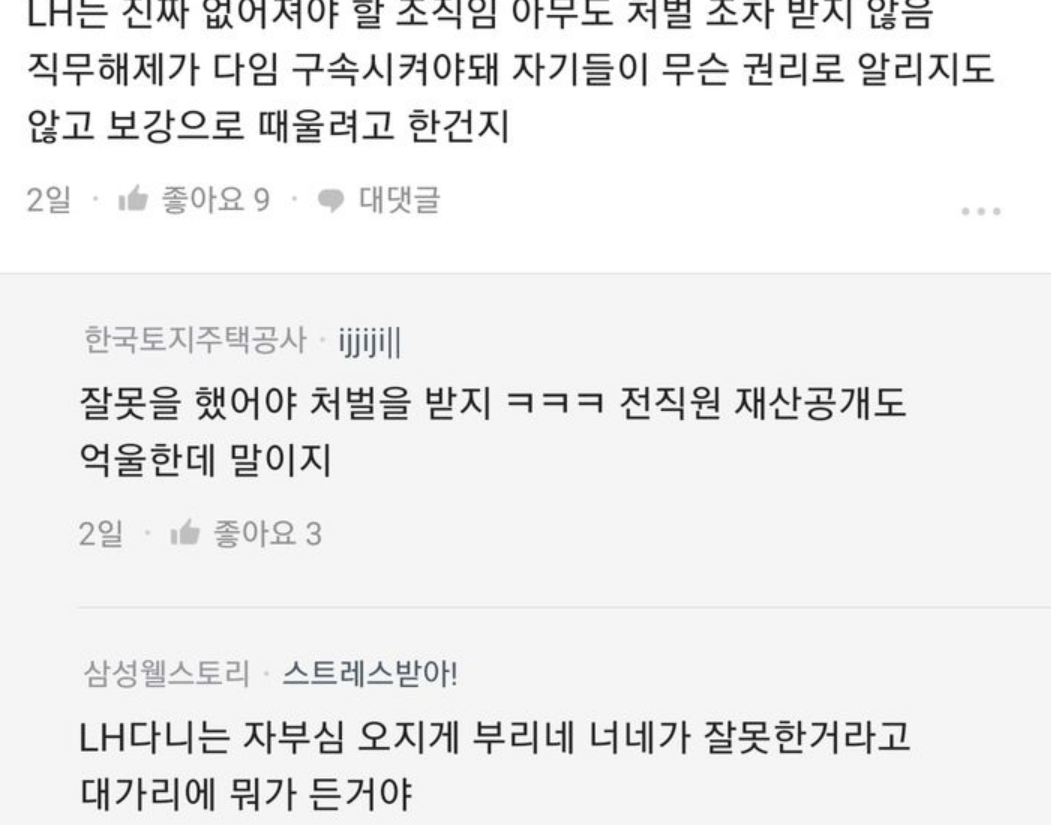 B씨는 'LH는 없어져야 할 조직임. 아무도 처벌 조차 받지 않음'이라는 다른 이용자 글에는 "잘못을 했어야 처벌을 받지. 전 직원 재산공개도 억울한데 말이지"라는 글을 남겼고, 'LH 해체해야 한다'는 글에는 "고마워 좀만 힘내줘"라는 비아냥 댓글을 남겼다.