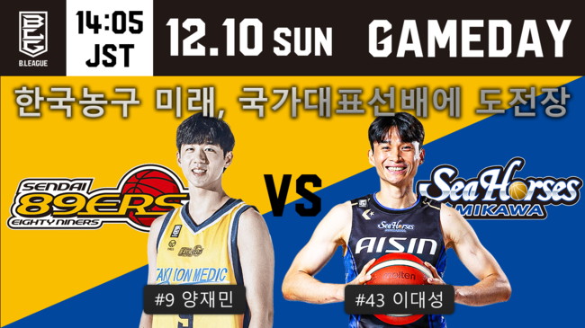 양재민의 소속팀 센다이 에이티나이너스는 오는 12월 9일 오후 2시와 10일 오후 4시에 걸쳐 일본 미야기현 센다이 홈구장 제비오 아레나에서 ‘2023-24시즌 B.리그 정규리그’에서 이대성의 소속팀 씨호스 미카와와 2연전을 가진다.