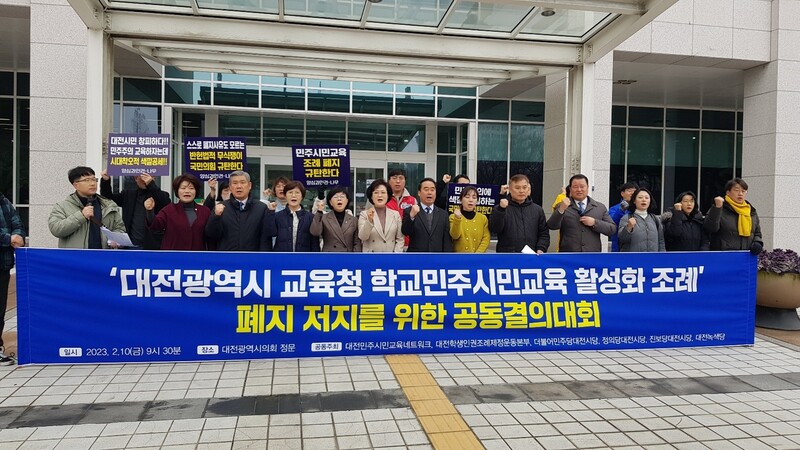 대전민주시민교육네트워크 등 시민단체와 더불어민주당·정의당·진보당 등 대전시당 관계자들이 지난 2월10일 오전 대전시의회 앞에서 국민의힘 소속 시의원들이 발의한 ‘대전교육청 학교민주시민교육 활성화 조례 폐지 조례안’ 철회를 주장하며 공동 결의대회를 열고 있다. 연합뉴스 |