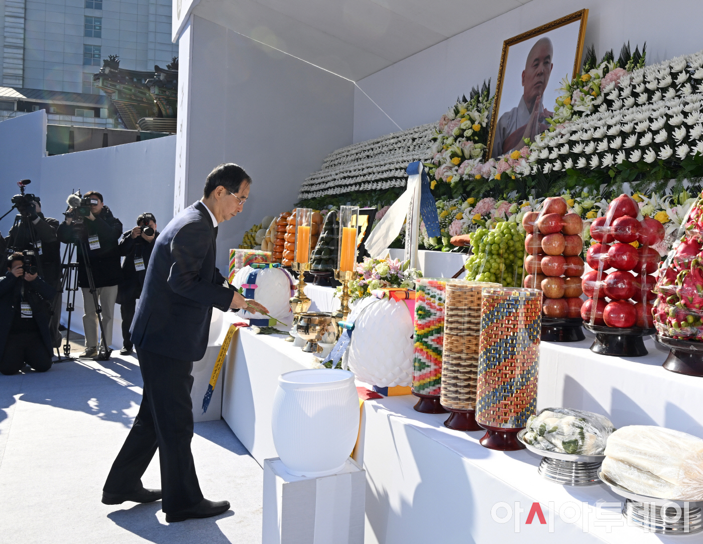 한덕수 국무총리가 3일 서울 종로구 대한불교조계종 총본산 조계사에서 열린 제33대·제34대 총무원장 해봉당 자승 대종사 종단장 영결식에서 헌화를 하고 있다. /송의주 기자 |