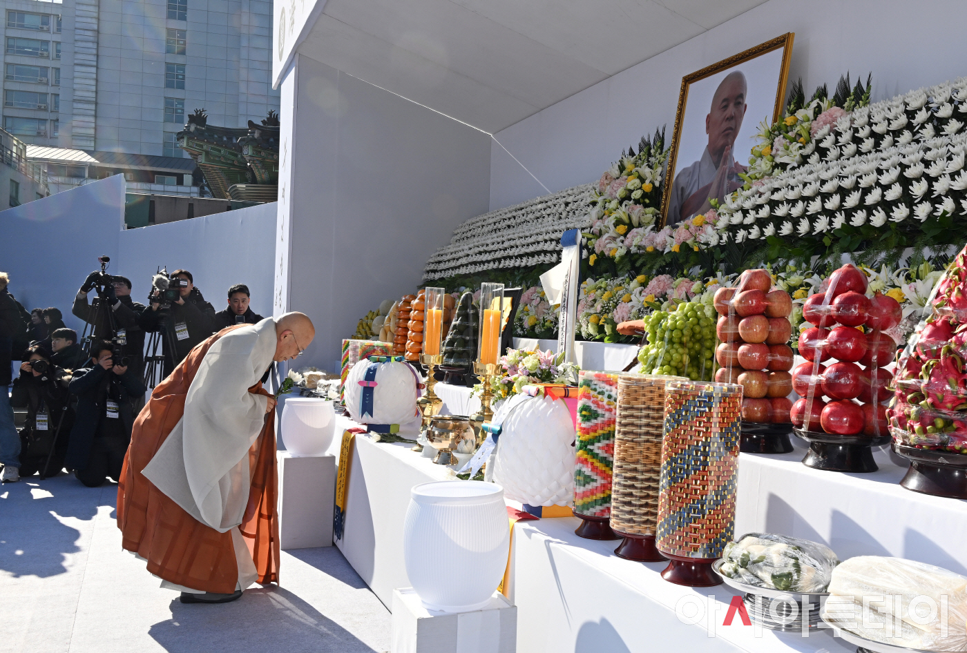 조계종 총무원장 진우스님이 3일 서울 종로구 대한불교조계종 총본산 조계사에서 열린 제33대·제34대 총무원장 해봉당 자승 대종사 종단장 영결식에서 헌화를하고 있다. /송의주 기자 |