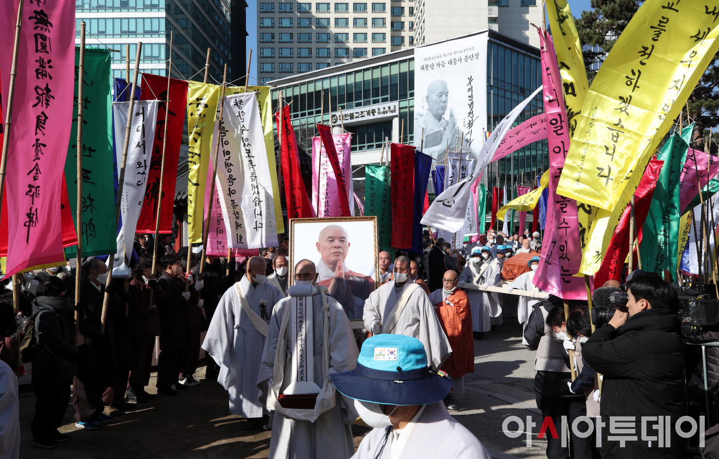 3일 서울 종로구 조계사에서 엄수된 해봉당 자승 대종사 영결식에서 자승 스님의 영정과 법구가 이운되고 있다. /송의주 기자 |