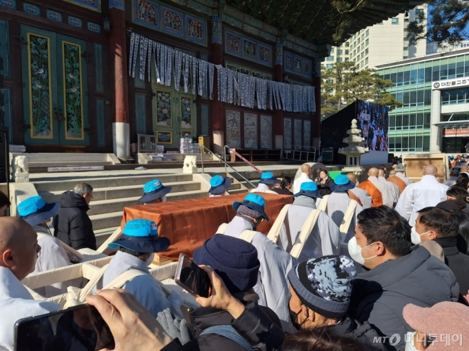 고령의 신도들은 두꺼운 패딩에 모자, 장갑을 준비하고 한 손에는 지팡이를 든 채 조계사를 찾았다. 아침 일찍 제주도에서 비행기를 타고 상경한 김문자씨(86)는 "처음에 소식을 듣고 하늘이 무너지는 느낌이었다"며 "우리를 이끌어준 스승님께서 멀리 떠나시는데 배웅해야 할 것 같아서 왔다"고 말했다.