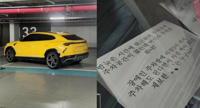해당 차주는 차 내부에 "밤늦은 시간에 퇴근하면 주차 자리가 없는데 어디에 세우냐", "장애인 주차 자리는 아침 9시까지 차 세워도 된다면서 사진 찍어 30건 제보한 XX는 누구냐?"라는 글을 적어뒀다.