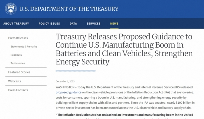 美 IRA 보조금 지급 제외 대상 세부지침 발표