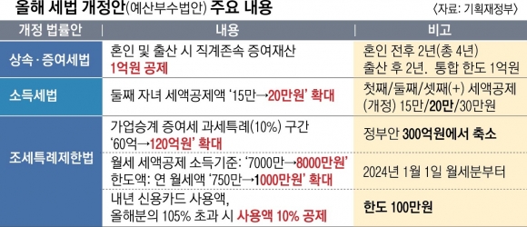결혼하는 자녀에게 1억원까지 비과세 증여를 허용하는 상속·증여세법 개정안은 야당이 출산한 자녀까지 포함하자고 주장하면서 범위가 더 넓어졌다. 기존 비과세 한도인 5000만원에 1억원을 더하고 양가를 합산하면 결혼·출산 부부는 최대 3억원까지 증여세를 내지 않고 물려받을 수 있다.
