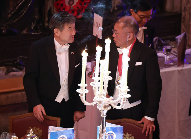 조태용 국가안보실장(왼쪽)과 정의선 현대차그룹 회장이 22일(현지시간) 영국 런던 금융특구 길드홀에서 열린 런던금융특구 시장 주최 만찬에 참석하고 있다./연합뉴스 |