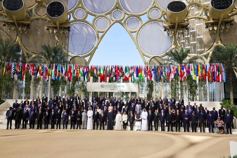 지난 1일 두바이에서 열린 제28차 유엔기후변화협약 당사국총회 정상회의(COP28)에 참석한 세계 정상과 대표단이 기념사진을 찍기 위해 포즈를 취하고 있다. AFP/연합뉴스 |