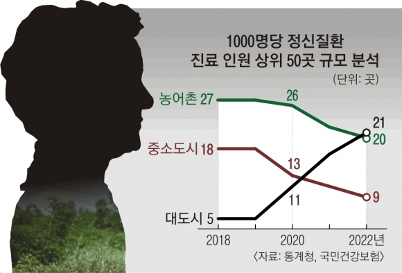 서울신문이 대한신경정신의학회와 함께 신현영 더불어민주당 의원실로부터 확보한 건강보험 데이터를 분석한 결과 지난해 기준 인구 1000명당 정신질환 진료인원 수 상위 50곳 중 20곳이 농어촌 지역이었다. 우리나라 대도시와 농어촌 지역의 정신건강 인프라의 양극화가 수치로 드러난 건 이번이 처음이다.