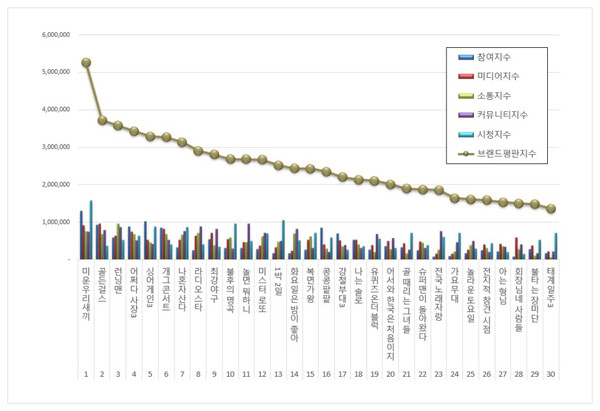 5위, 싱어게인3 브랜드는 참여지수 1,011,730 미디어지수 525,923 소통지수 457,602 커뮤니티지수 420,577 시청지수 877,333이 되면서 브랜드평판지수 3,293,164로 분석됐다.