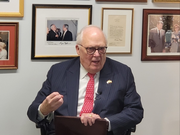 에드윈 퓰너 헤리티지재단 아시아연구센터 회장이 지난달 28일(현지시간) 미 워싱턴DC 인근 자신의 사무실에서 대한무역투자진흥공사(코트라) 주관으로 워싱턴특파원단과 공동인터뷰를 하고 있다. 워싱턴 공동취재단 |