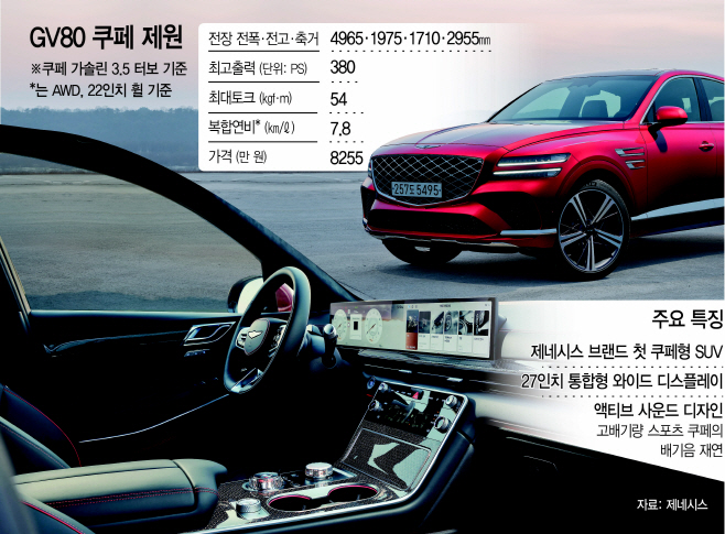 GV80 쿠페의 판매가격은 8255만원부터 시작한다. 시승한 차량은 뱅앤올룹슨 사운드 패키지·제네시스 액세서리 항목을 제외한 풀옵션 모델로 1억135만원이다. 벤츠 GLE 쿠페·BMW X6 등 세련되면서 감각적인 럭셔리 SUV 쿠페를 원하는 소비자에게 이 차를 추천한다.