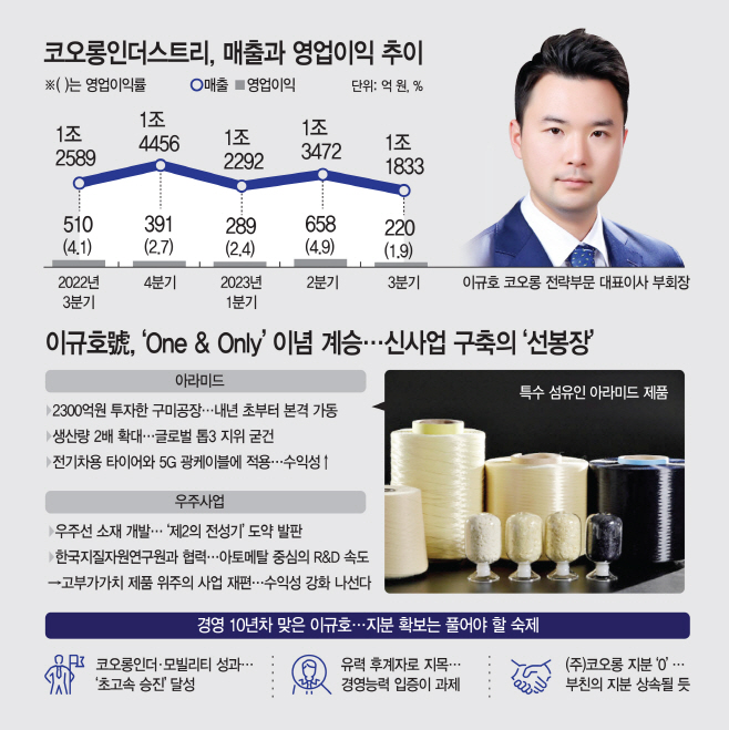 올해 임원인사에서 코오롱가(家) 4세 이규호 사장이 부회장으로 승진하면서 그룹의 미래가치 제고와 사업 혁신을 이끌게 된 만큼 코오롱인더스트리의 포트폴리오 변화가 그룹의 전환점이 될 지 주목된다.