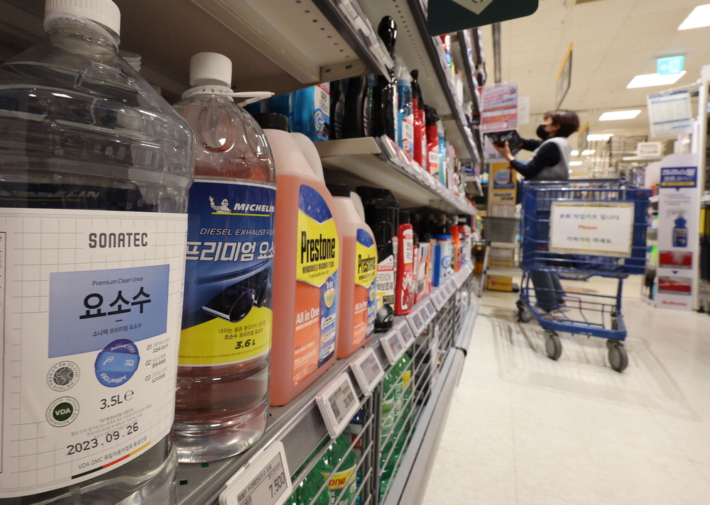중국이 요소 수출을 제한한 가운데 아직 시장에서 사재기 현상은 나타나지 않고 있다. 4일 서울 시내 한 대형 마트에 요소수가 진열돼 있다. 이충우 기자 |