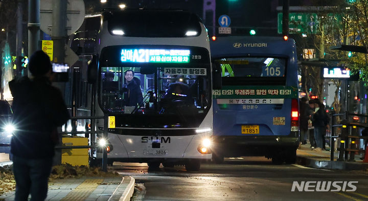 [서울=뉴시스] 최진석 기자 = 4일 서울 종로구 동대문역.흥인지문 버스정류장으로 '심야A21번' 심야자율버스가 도착하고 있다. 2023.12.04. myjs@newsis.com |