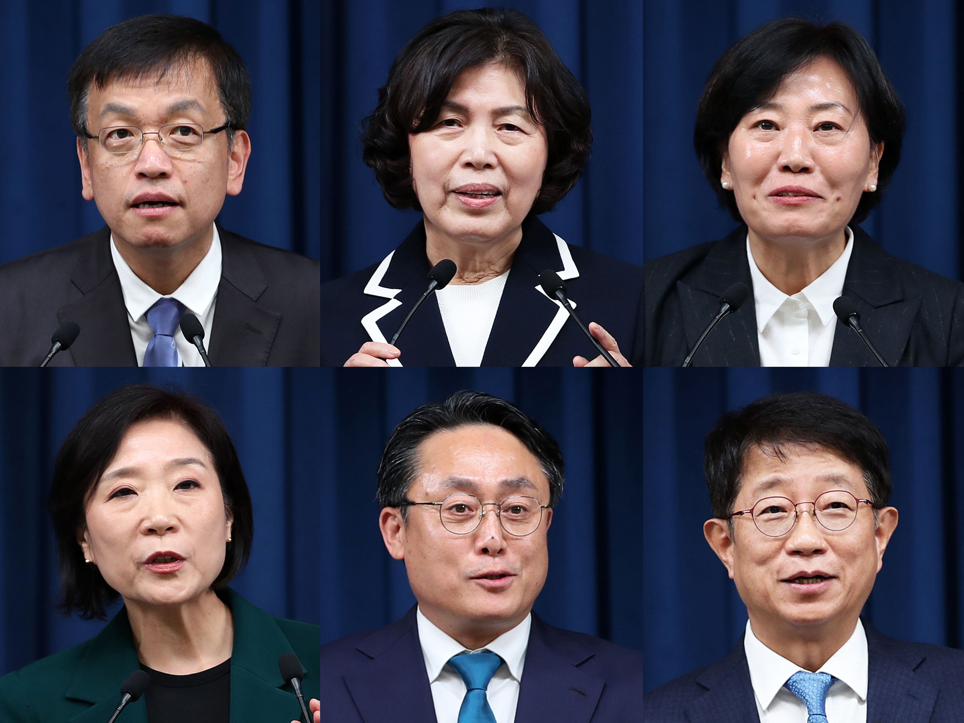 4일 윤석열 대통령이 6개 부처 장관 후보자 발표했다. 윗줄 왼쪽부터 시계방향으로 최상목 경제부총리 겸 기획재정부 장관 후보자, 강정애 국가보훈부 장관 후보자, 송미령 농림축산식품부 장관 후보자, 박상우 국토교통부 장관 후보자, 강도형 해양수산부 장관 후보자, 오영주 중소벤처기업부 장관 후보자./뉴스1 |