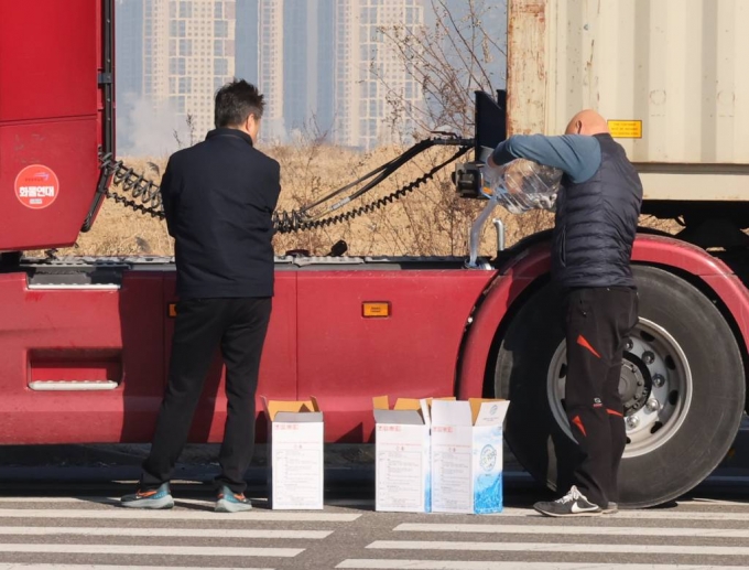 [인천=뉴시스] 전진환 기자 = 중국이 한국으로 보내는 요소 통관을 보류한 가운데 4일 인천 연수구 인천신항 인근 도로에서 화물차 운전기사가 차량에 요소수를 넣고 있다. 국내 업체의 대중국 요소 의존도가 90%에 달하면서 2년 전 요소수 대란이 재현될 수도 있다는 우려가 나오고 있다. 2023.12.04. |