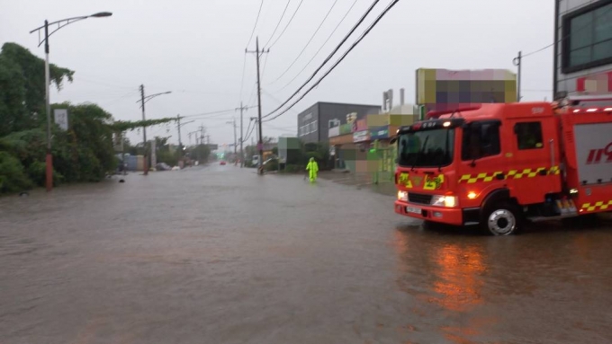 호우특보가 내려진 17일 오전 부산 강서구의 한 도로에 침수가 발생했다. (사진=부산소방재난본부 제공) 2023.09.17. *재판매 및 DB 금지 |