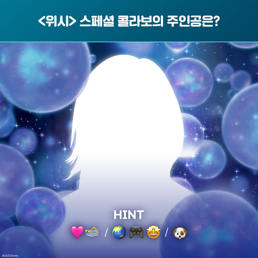 2024년 1월 3일 개봉을 앞둔 영화 '위시'가 스페셜 콜라보 뮤직비디오의 주인공을 찾는 'Guess Who?'이벤트를 전격 오픈했다. 작품 속 주요 상징으로 등장하는 소원이 담긴 방울들 사이로 신비로운 실루엣을 드러낸 주인공은 '겨울왕국 2'의 태연, '뮬란'의 AKMU 수현, '인어공주'의 뉴진스 다니엘을 잇는 최정상 아티스트로 그 정체에 대한 궁금증이 커지고 있다.