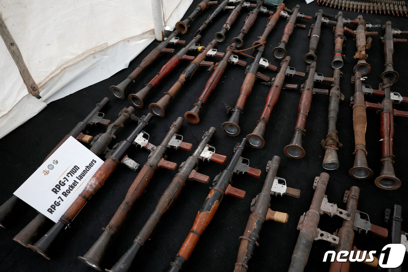 이스라엘군이 지난 11월20일(현지시간) 이스라엘 중부의 츠리핀 군사 기지에서 팔레스타인 무장정파 하마스 대원들이 10월7일 기습 공격 당시 사용한 것으로 추정되는 무기를 공개하고 있다. 2023.11.21 ⓒ 로이터=뉴스1 ⓒ News1 정지윤 기자 |