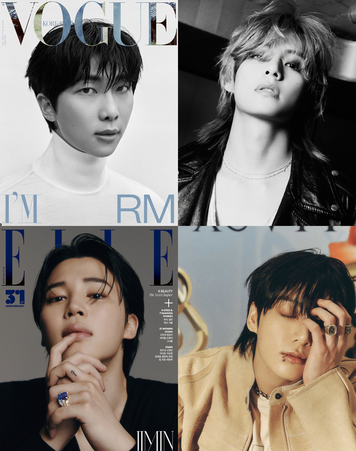 방탄소년단 RM, 뷔, 정국, 지민. (왼쪽 위부터 시계방향으로) 사진 | 보그, 엘르, 빅히트뮤직 |