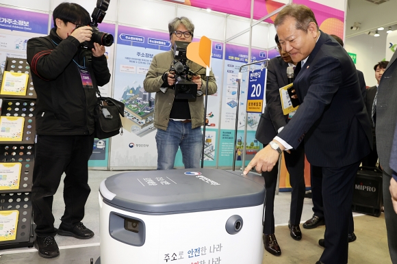 이상민 행안부 장관이 지난달 25일 부산 벡스코에서 열린 대한민국 정부 박람회에서 주소 기반 배달 로봇 ‘뉴비’가 가져온 물건을 받고 있다. 행안부 제공 |