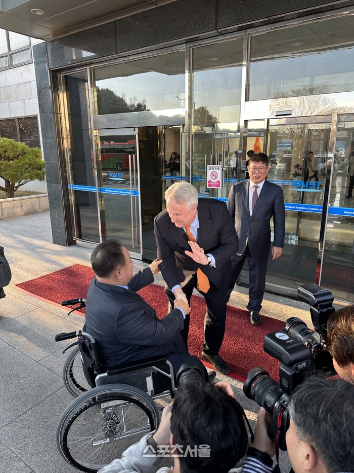 지난 11월 21일, 국민의힘 혁신위원회(위원장 인요한)가 대전 유성구 카이스트 본관 1층 제1회의실에서 최근 민주당을 탈당한 이상민 국회의원(5선)을 초청하여 R&D 관련 거버넌스체계 개선 등에 관한 토론회를 마치고 이 의원을 배웅하고 있다. 사진 | 조준영 기자 |