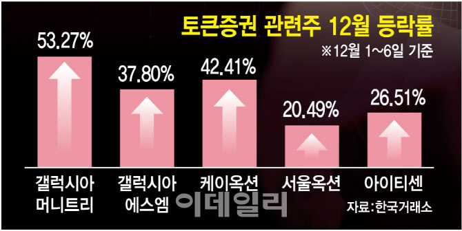 6일 한국거래소에 따르면 이달 들어(12월1일~6일) 토큰증권 관련주들이 급등하고 있다. 갤럭시아머니트리(094480)는 53.27% 급등했고, 갤럭시아에스엠(011420)은 37.80% 올랐다. 케이옥션(102370)과 서울옥션(063170)은 각각 42.41%, 20.49% 상승했다. 아이티센(124500)도 26.51% 오르는 등 토큰증권 관련주들 사이에서 온기가 감돌고 있다.