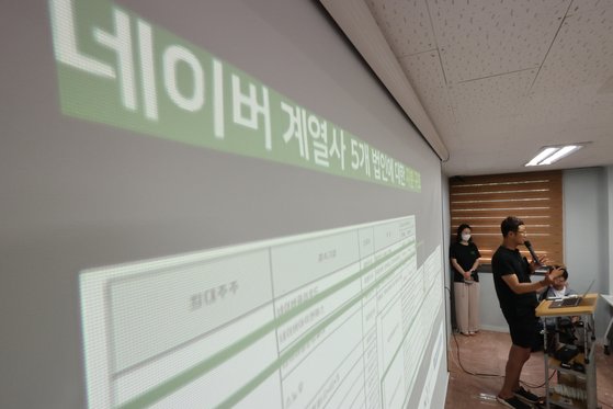 지난해 7월 네이버 노동조합인 '공동성명'(전국화학섬유식품산업노동조합 네이버지회) 조합원들이 서울 중구 상연재에서 '이루기 위해 즐기는 투쟁- 풀파워업 프로젝트' 기자회견을 하고 있다. 사진 연합뉴스 |