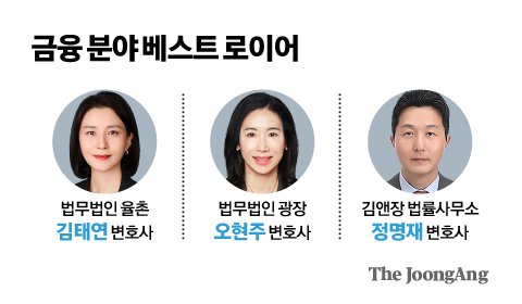 2023년 금융 분야 베스트 로이어에는 김태연(법무법인 율촌), 오현주(법무법인 광장), 정명재(김앤장 법률사무소) 변호사가 이름을 올렸다(성명 가나다순). 김태연 변호사(사법연수원 33기)는 금감원에서 16년간 근무한 경력을 바탕으로 한 베테랑 규제 전문가다. 평가에 참여한 변호사들로부터 “실무감각이 좋고 신뢰할 수 있다”는 평가를 받았다. 최근 사모펀드 사태 관련 일부 금융회사의 자문에 응해 ‘금감원 조치 대상에서 제외’하는 성과를 거뒀다. 오현주 변호사(연수원 28기)는 대규모 해외 증권 발행 등 자본시장 규제와 금융 분쟁 자문을 수행해왔다. 금감원 분쟁조정 전문위원, 금융위 스튜어드십 코드 태스크포스(TF) 위원 등 다양한 공익활동에도 참여하고 있다. 평가위원들은 “정책 분야의 변화를 선도하며 쌓아 올린 실력이 높게 평가받았다”고 전했다. 금융 분야에서 ‘김앤장의 간판’으로 통하는 정명재 변호사(연수원 25기)는 주식 자본시장(ECM)과 부채 자본시장(DCM) 등과 관련한 자문을 20년 이상 맡아 한국 자본시장의 발전사를 써내려 왔다고 평가받는다. 최근 쿠팡이 나스닥에 상장하는 데 큰 역할을 하기도 했다.