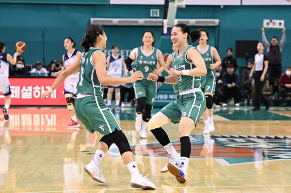 환호하는 부천 하나원큐의 정예림과 김정은. WKBL 제공 |