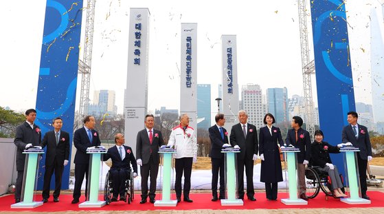 올림픽회관 재개관 행사에서 참가자들이 3개 체육단체 입간판 제막식을 진행하고 있다. 연합뉴스 |