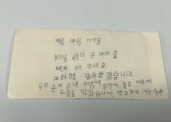익명의 기부자가 건넨 봉투 한 면에는 서툰 글씨로 부모 없이 성장하는 아이들에게 써달라는 당부가 쓰여 있었다. 기부금이 "약소"하다며 자신에 대해선 "94세"라고만 소개했다.