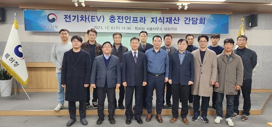 임영희 특허청 전기통신심사국장(앞줄 왼쪽에서 3번째)이 12. 6.(수) 14시 특허청 서울사무소에서 전기차(EV) 충전인프라 지식재산 간담회를 진행하고, 관계자들과 기념촬영을 하고 있다. |