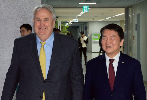 인요한 국민의힘 혁신위원장과 국민의힘 안철수 의원이 7일 오후 서울 여의도 국회 의원회관에서 면담을 하기 위해 회의실로 향하고 있다. 연합뉴스 |
