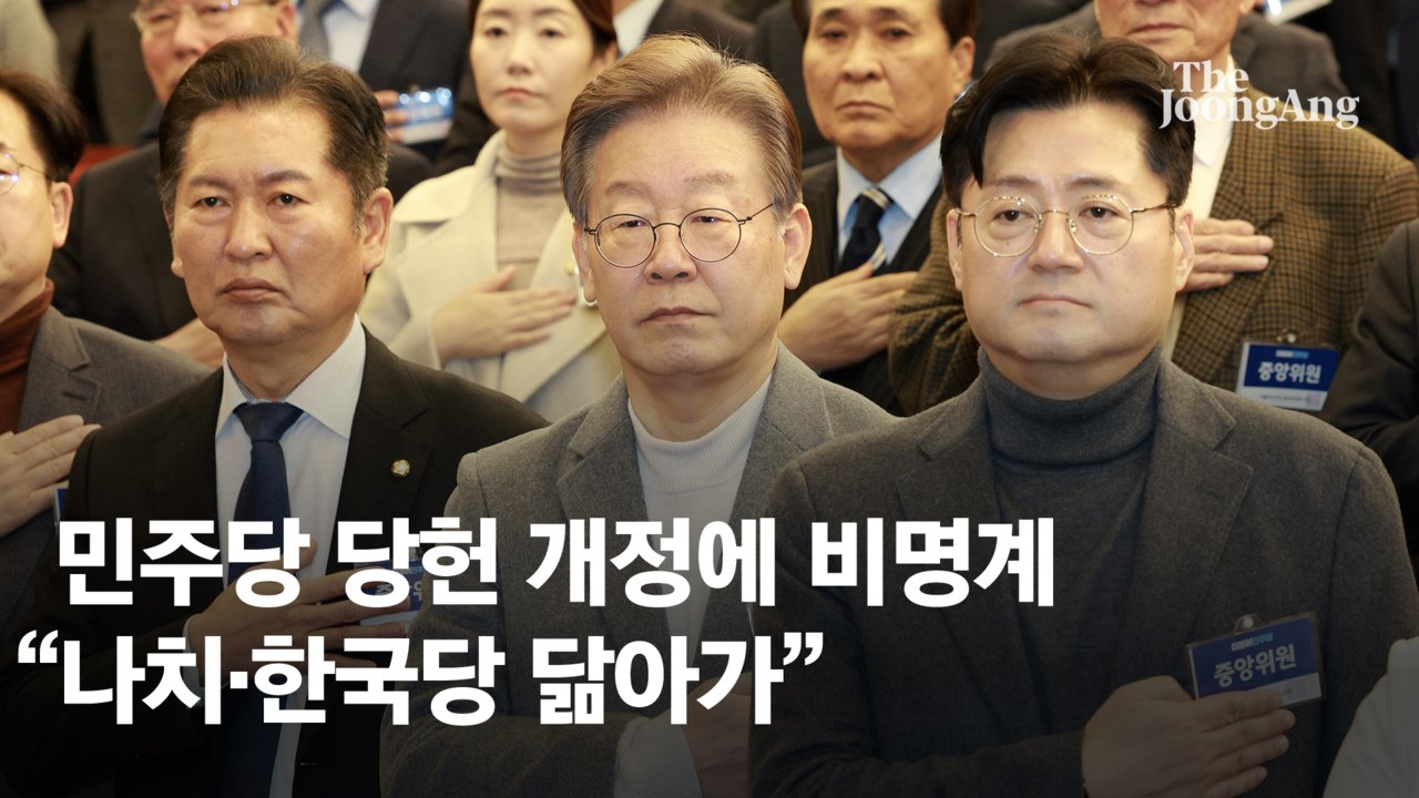 비명계 이원욱 의원은 “황교안 전 자유한국당 대표는 태극기 부대의 결합으로 총선에서 패배했다. 우리가 가려는 꼴이 그 모습을 닮아있다”며 이 대표를 면전에서 비판했다. 그가 민주당을 ‘나치 정당’에 비유하자 장내에선 “허허” “말씀을 그렇게 하십니까” 등 반발이 나왔다. 비명계 윤영찬 의원은 “제가 ‘왕수박’이라 알려져서 공천 떨어질까 봐 저런다는 오해를 받을까봐 발언하지 않으려 했는데, (당헌 개정은) 축구장에서 갑자기 심판이 경기를 중단시키고 룰을 바꾸라는 것”이라고 지적했다.