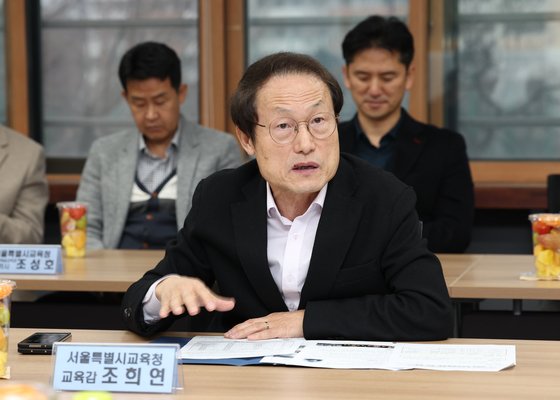 조희연 서울시교육감이 지난 6일 오후 서울 강동구 배재중학교를 방문, 학교 현안에 대해 교직원 등과 간담회를 하고 있다. 사진 서울시교육청 |