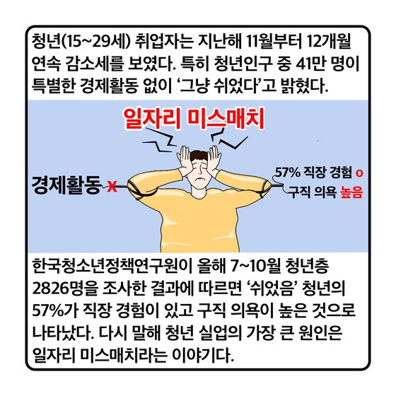 한국청소년정책연구원이 올해 7~10월 청년층 2826명을 조사한 결과에 따르면 ‘쉬었음’ 청년의 57%가 직장 경험이 있고 구직 의욕이 높은 것으로 나타났다. 직장 경험과 구직 의욕 모두 없는 청년은 14%뿐이었다. ‘쉬었음’ 청년의 다수는 직장을 다니고는 싶지만, 원하는 일자리가 없어 쉬고 있다는 뜻이다. 다시 말해 청년 실업의 가장 큰 원인은 일자리 미스매치라는 이야기다.