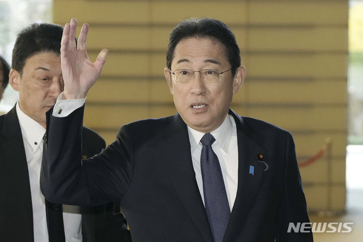 [도쿄=AP/뉴시스]지난 8일 기시다 후미오 일본 총리가 기자들에게 손을 들어 보이고 있다. 기시다 내각을 지지한다는 응답은 23%로 지난해 11월 조사보다 6%포인트 하락, 지난해 10월 내각 출범 후 최저치를 기록한 반면 '지지하지 않는다'는 응답은 6%포인트 상승한 58%를 기록한 것으로 11일 발표된 NHK 여론조사에서 나타났다. 2023.12.11. |