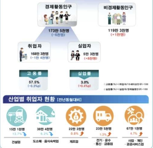 이 가운데 경제활동인구는 173만5천명으로 작년보다 6천명 감소했고, 비경제활동인구는 119만3천명으로 작년보다 1천명 늘었다.