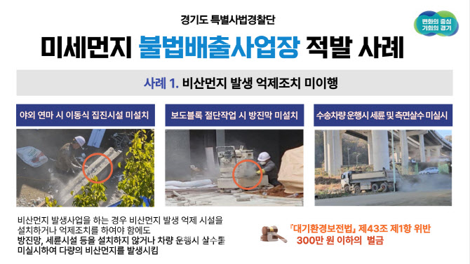 안양시 소재 C업체는 공사장의 벽면을 연마하는 과정에서 다량의 비산먼지가 발생하는데도 전동연마기에 이동식 방진망을 설치하지 않는 등 비산먼지 발생 억제조치를 하지 않고 작업을 해왔다. 부천시 소재 D업체도 건축물 축조공사로 야외에서 보도블록을 절단하면서 방진망 등 억제시설을 설치하지 않고 작업하며 비산먼지를 날리다 적발됐다.