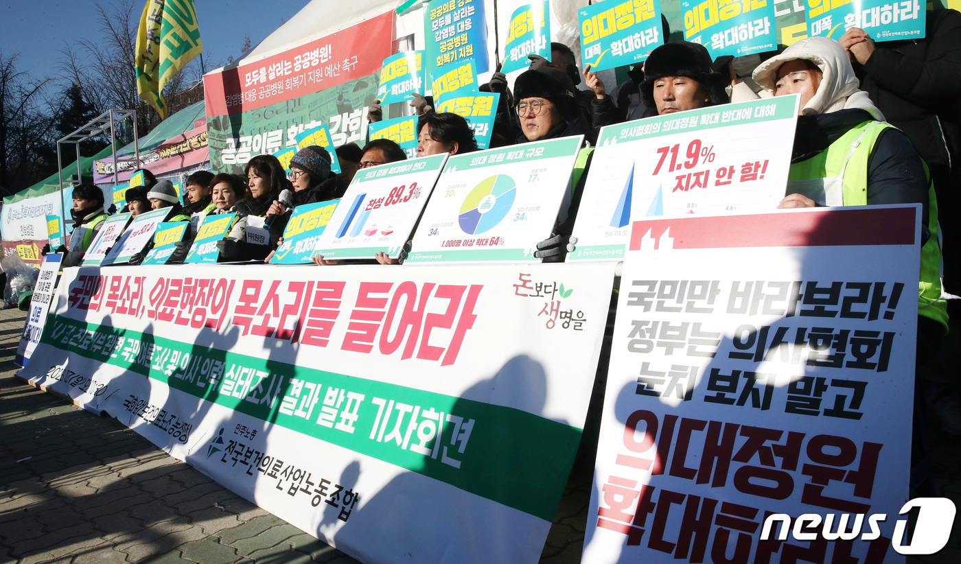 (서울=뉴스1) 임세영 기자 = 민주노총 전국보건의료산업노동조합 관계자들이 17일 오전 서울 여의도 국회 앞에서 의사 집단 진료거부 관련 국민여론조사 및 의사인력 실태조사 결과 발표 기자회견을 갖고 있다. 2023.12.17./뉴스1