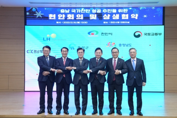국토교통부와 충남도, 천안시, 홍성군, 한국토지주택공사(LH), 충남개발공사는 18일 천안시청사에서 국가산단 성공 추진을 위한 현안 회의 및 상생협력 협약을 체결했다.